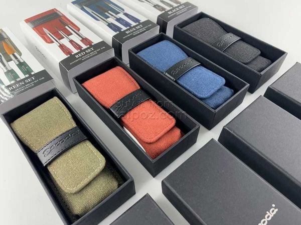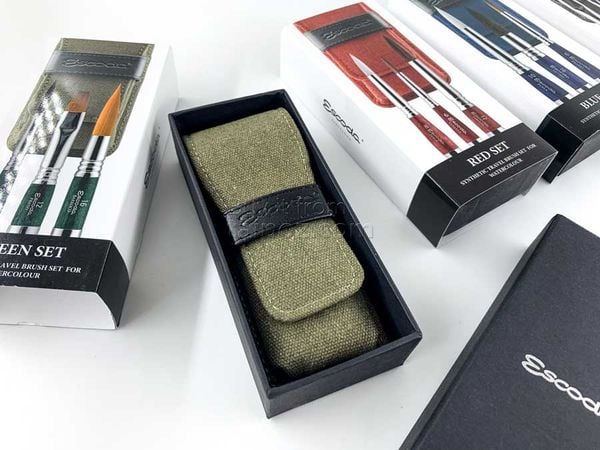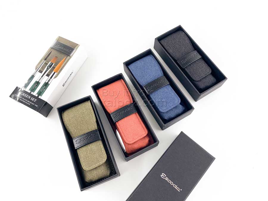 • Để đáp ứng nhu cầu vẽ đa dạng của các họa sĩ khi đi du lịch, đi vẽ ngoài trời, Escoda ra mắt dòng cọ theo bộ đựng trong túi canvas được may giống với túi da Escoda. Chất liệu này giúp giá thành sản phẩm phù hợp hơn với số đông người dùng, trong khi vẫn không làm mất đi kỹ thuật gia công tinh xảo vốn có của các nghệ nhân làm cọ Escoda. • Kiểu cọ travel nên thân kim loại có thể tháo rời, đậy kín và bảo vệ tốt đầu cọ. • Sản phẩm làm tại Tây Ban Nha.
