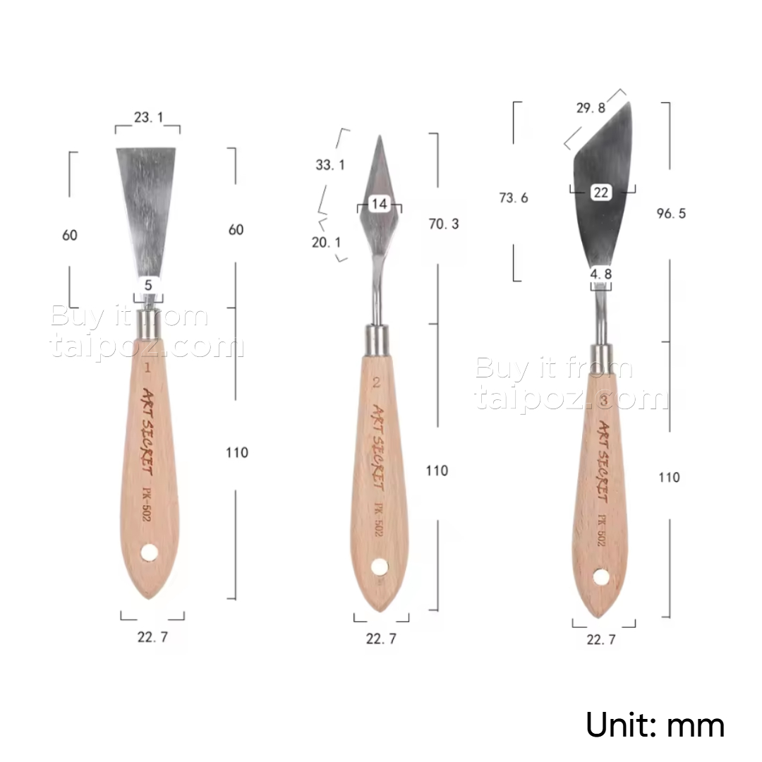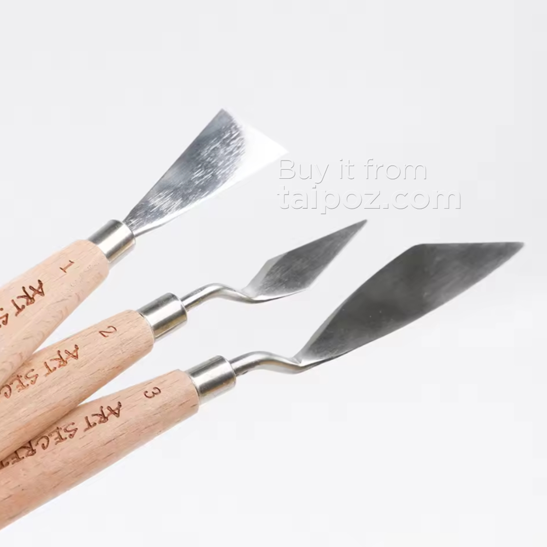 Bộ 3 bay vẽ chất liệu thép không gỉ, với tay cầm bằng gỗ Dẻ Gai (Beechwood). Với 3 hình dáng khác nhau đáp ứng được các nhu cầu cơ bản để người nghệ sĩ sáng tạo.