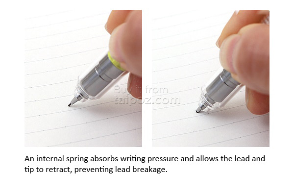 • Bút chì bấm Mogulair có bộ phận cơ khí độc đáo, hấp thụ lực viết giúp mang tới trải nghiệm viết êm và mượt như viết với bút bi. Bộ phận này còn giúp bảo vệ ruột chì khỏi lực vẽ/ viết mạnh có thể làm gãy ruột chì.