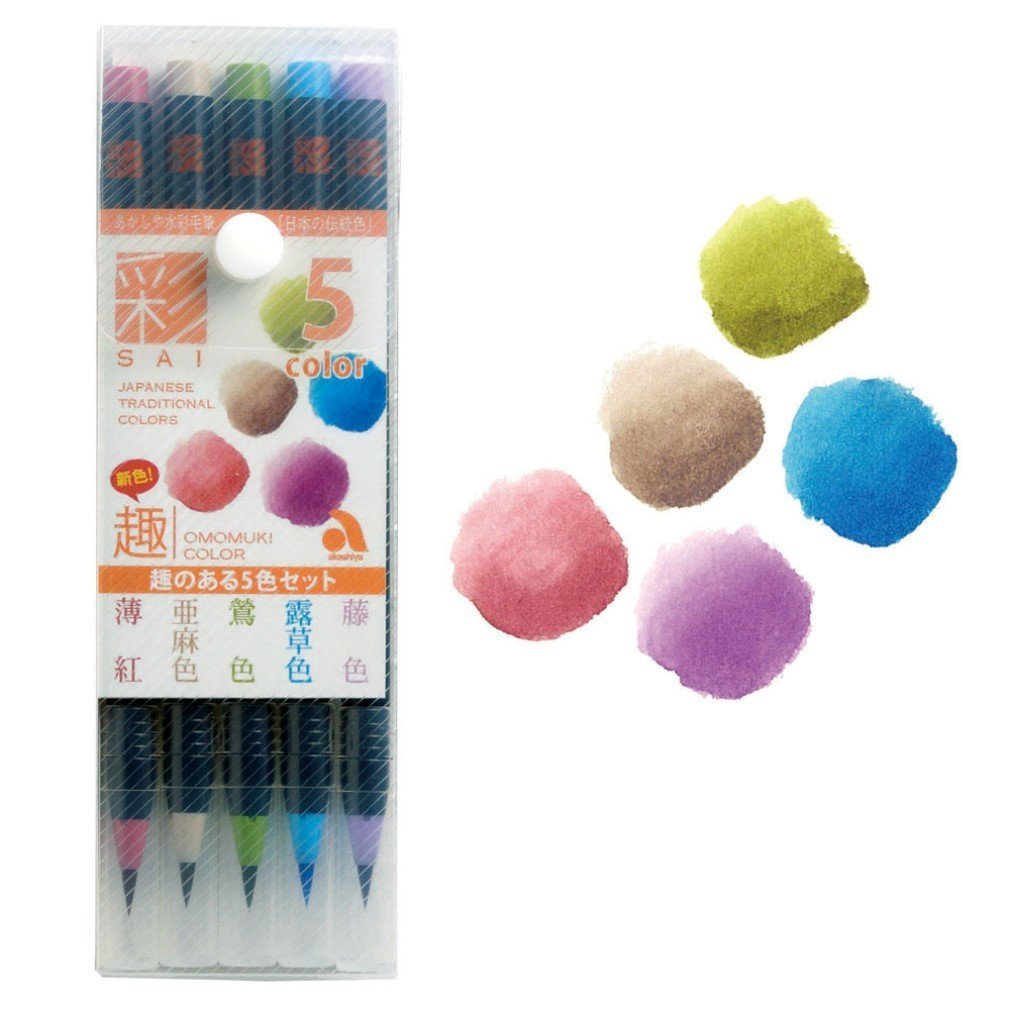 • Hộp 5 màu, chia theo 2 chủ đề: Omomuki và Stuya. Đây cũng là 2 set màu mới của bút lông vẽ màu nước Akashiya Sai.
