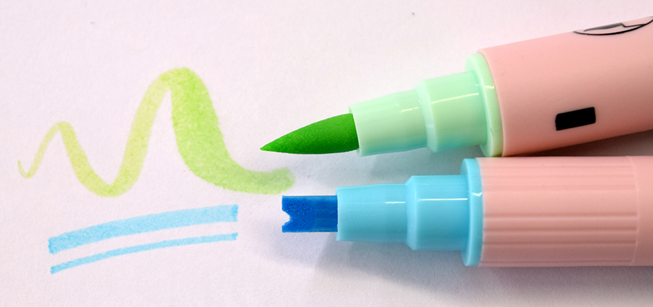 • Bút có 2 đầu: một đầu scroll kích thước 3.5mm và một đầu brush, mang tới sự linh hoạt khi sử dụng. Điểm tốt của bút là chất liệu làm đầu bút khá chất lượng, mang tới sự cứng cáp lẫn độ bền ngòi trong suốt quá trình sử dụng, thâm chí cho đến khi bút hết mực.