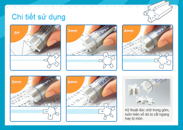 • Gôm có hình dáng rất độc đáo, hình 5 cánh sao, mỗi cánh có độ dày nét khác nhau, lần lượt là: kiểu đầu tam giác, 3mm, 4mm, 5mm và 6mm, cho phép bạn gôm chính xác nhiều kiểu kích thước.
