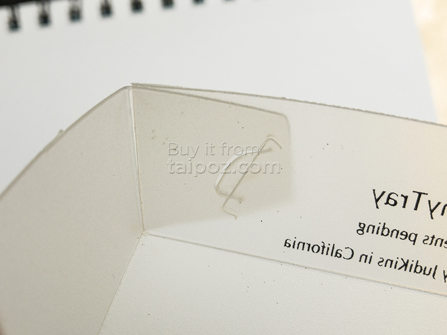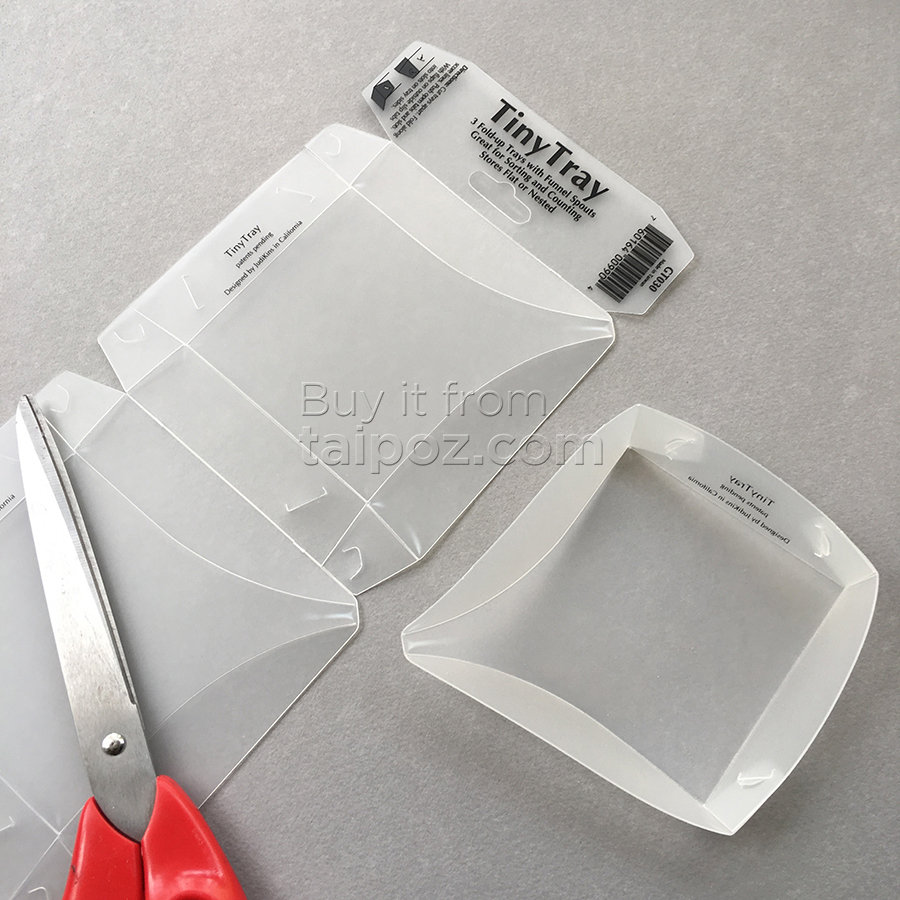 • Chất liệu plastic, dạng miếng mỏng, khi dùng bạn chỉ cần gấp theo đường cắt có sẵn là sẽ thành 1 cái khay đựng nhỏ nhắn xinh xắn. Điểm độc đáo là khay còn có miệng phễu dài giúp trút các linh kiện trở lại lọ đựng rất dễ dàng